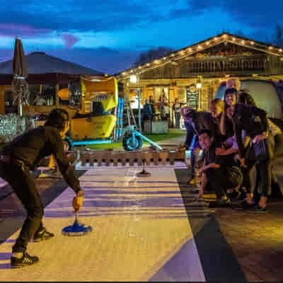 Spiele auf einer unseren hochmodernen Eisstockbahn in stimmungsvollem Ambiente. Genieße die winterliche Atmosphäre und den geselligen Charakter des Spiels. Für jeden Teilnehmer ist ein kostenloser Glühwein enthalten.
